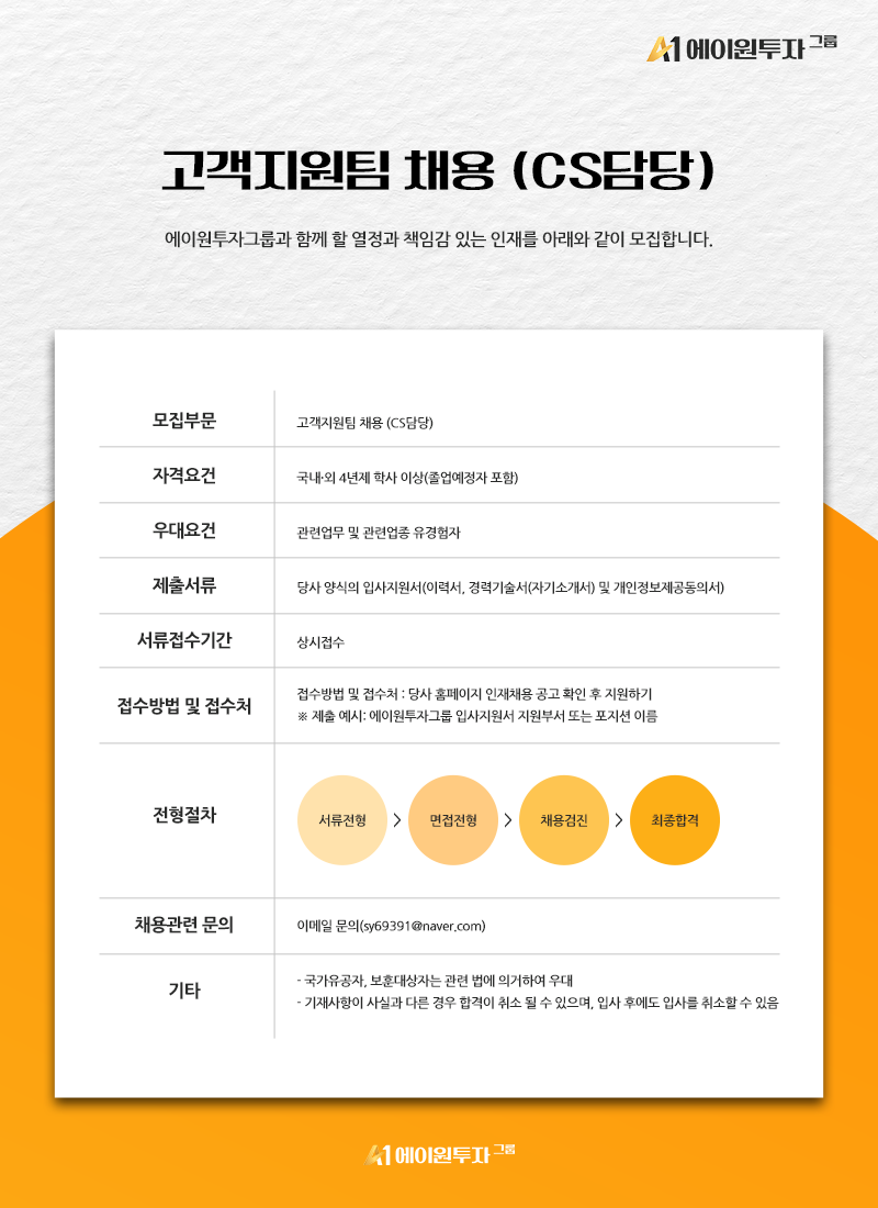 [에이원] 고객지원팀 채용 (CS담당)